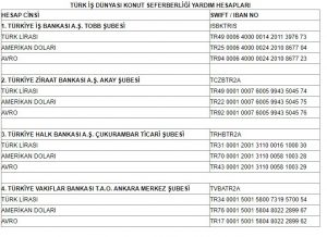 Türk İş Dünyası Konut Kampanyası kapsamında hesap numaraları ekte yer almaktadır. Ayrıca hesap numaraları TOBB’un resmi sitesinde (https://tobb.org.tr/Sayfalar/KonutKampanyasi.php) de bulunmaktadır.